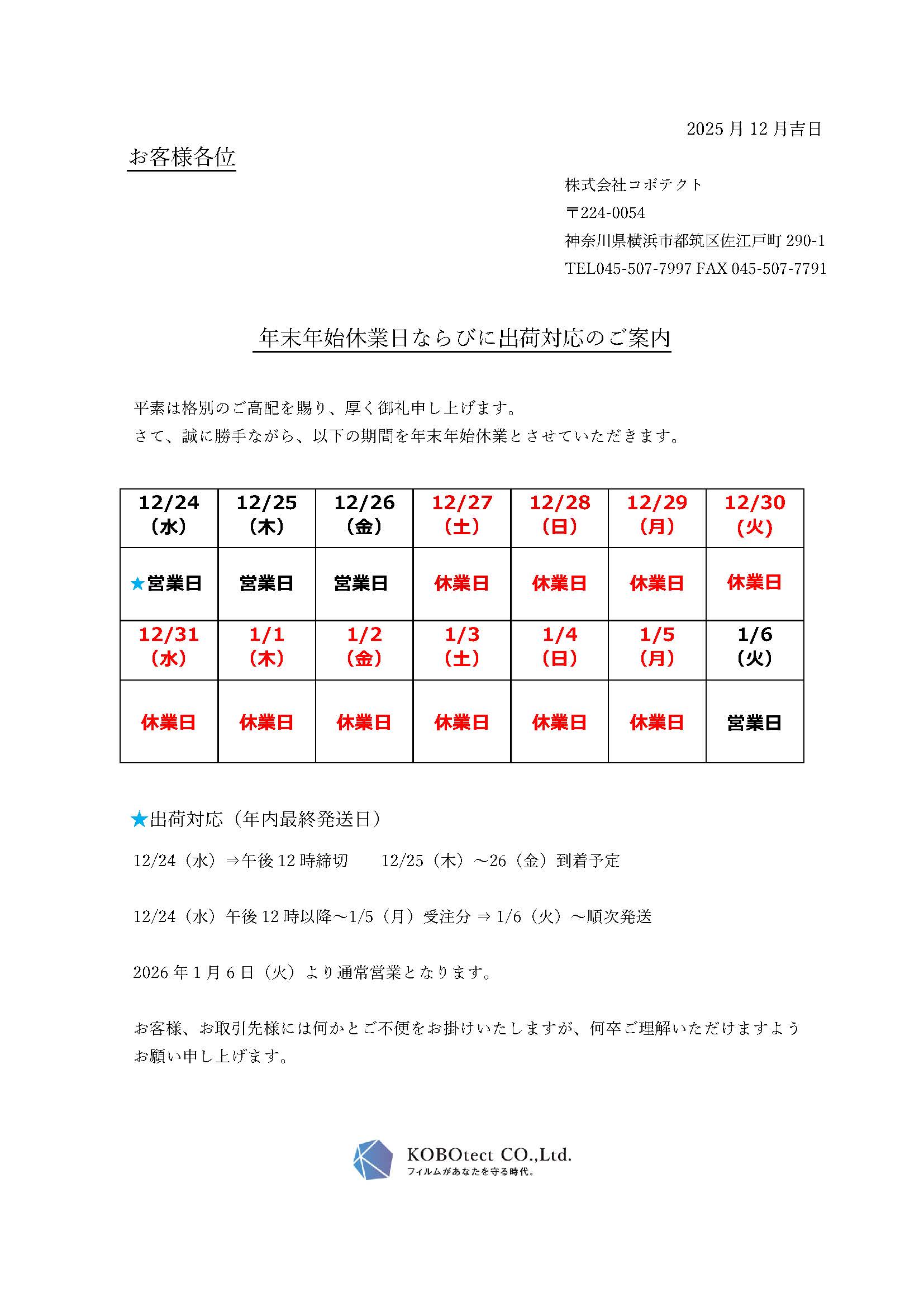 さて、誠に勝手ながら、以下の期間を年末年始休業とさせていただきます。